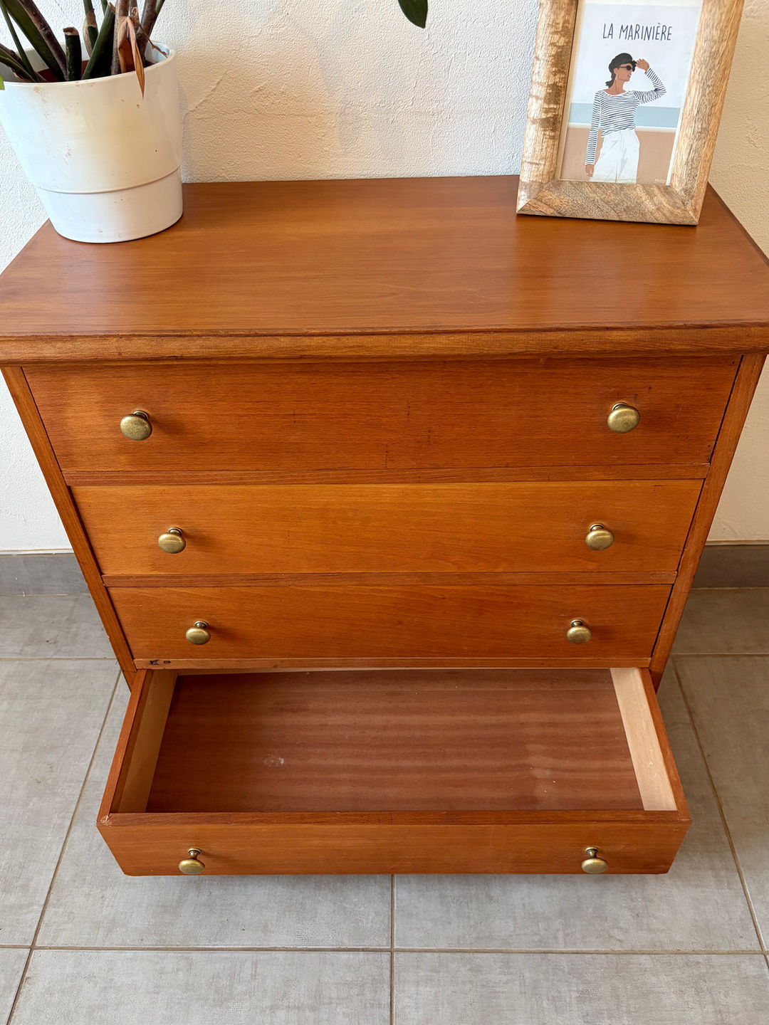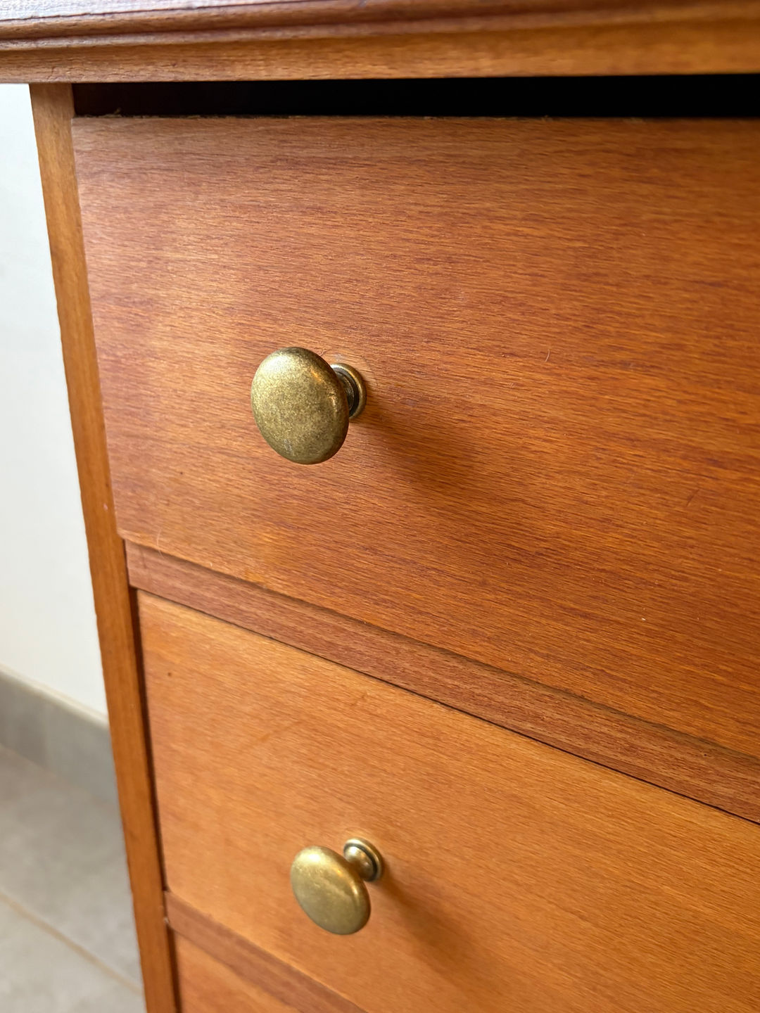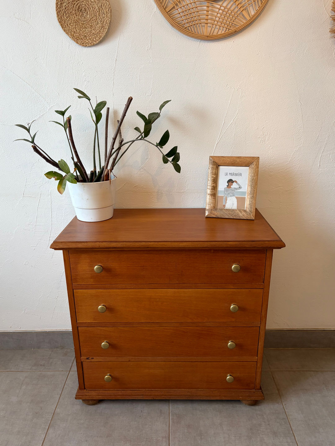 4 tiroirs, teinte miel ,boutons dorés , pieds boule