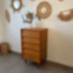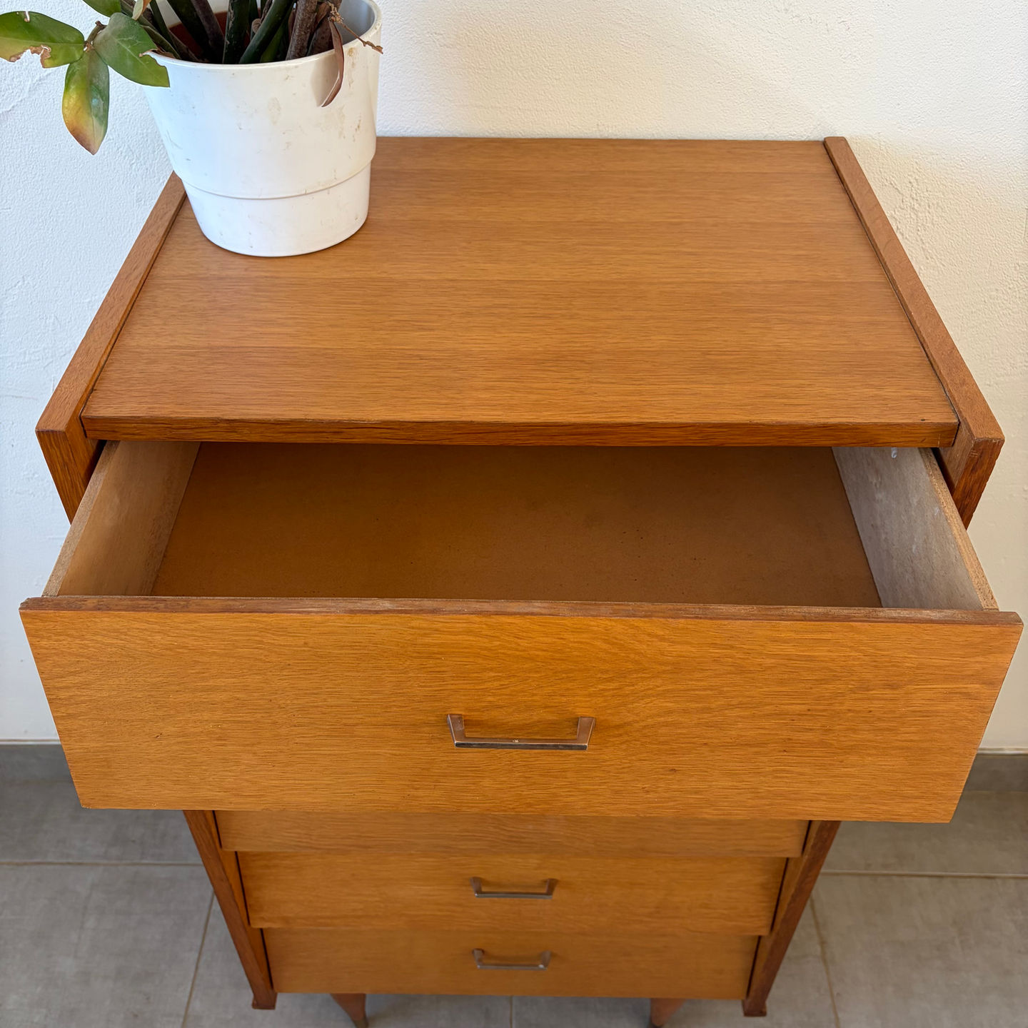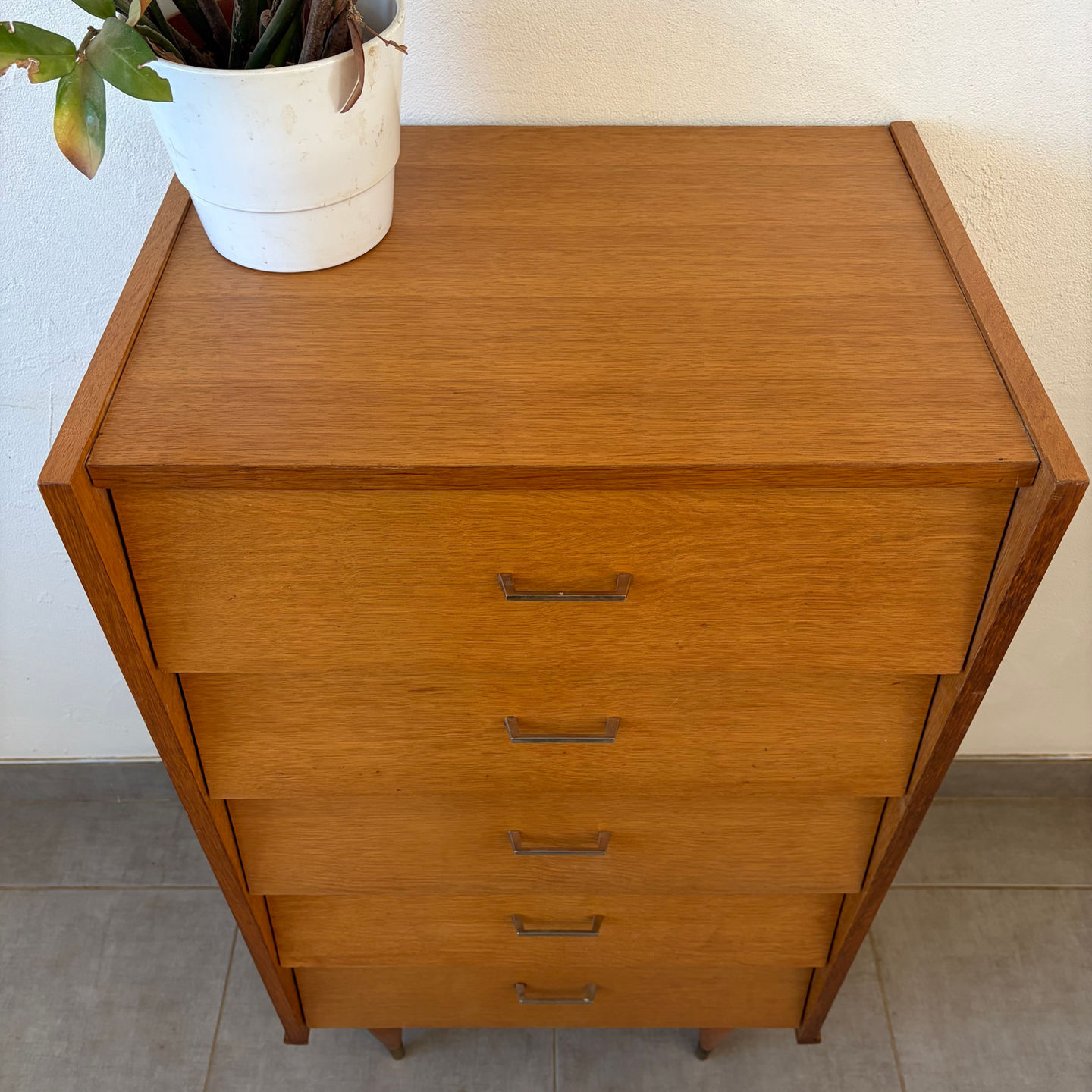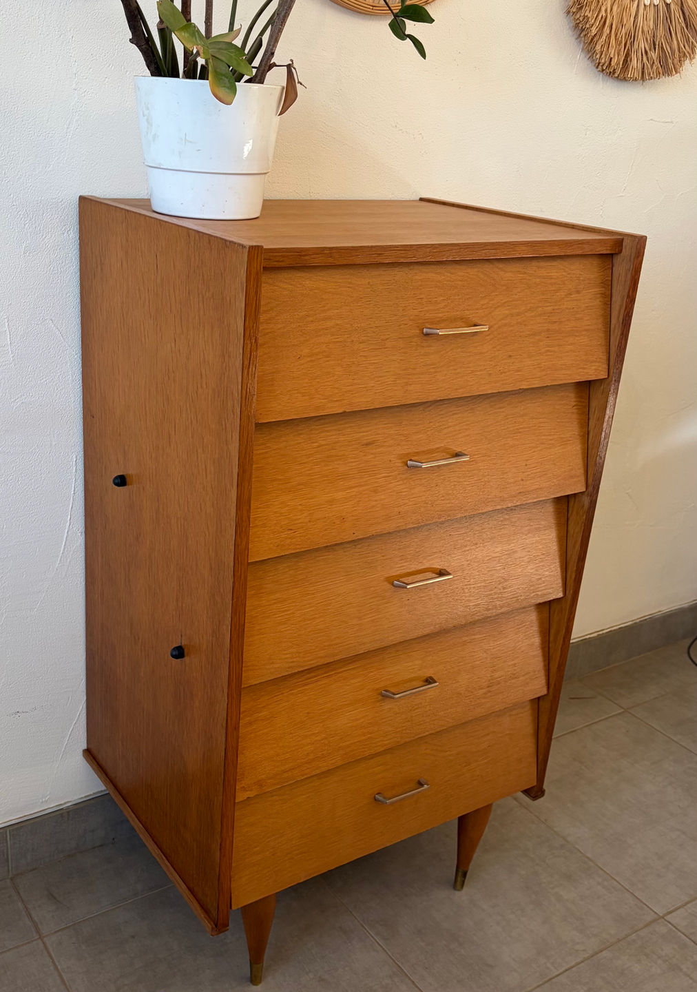 5 tiroirs, poignées en laiton doré d’époque et d’origine.