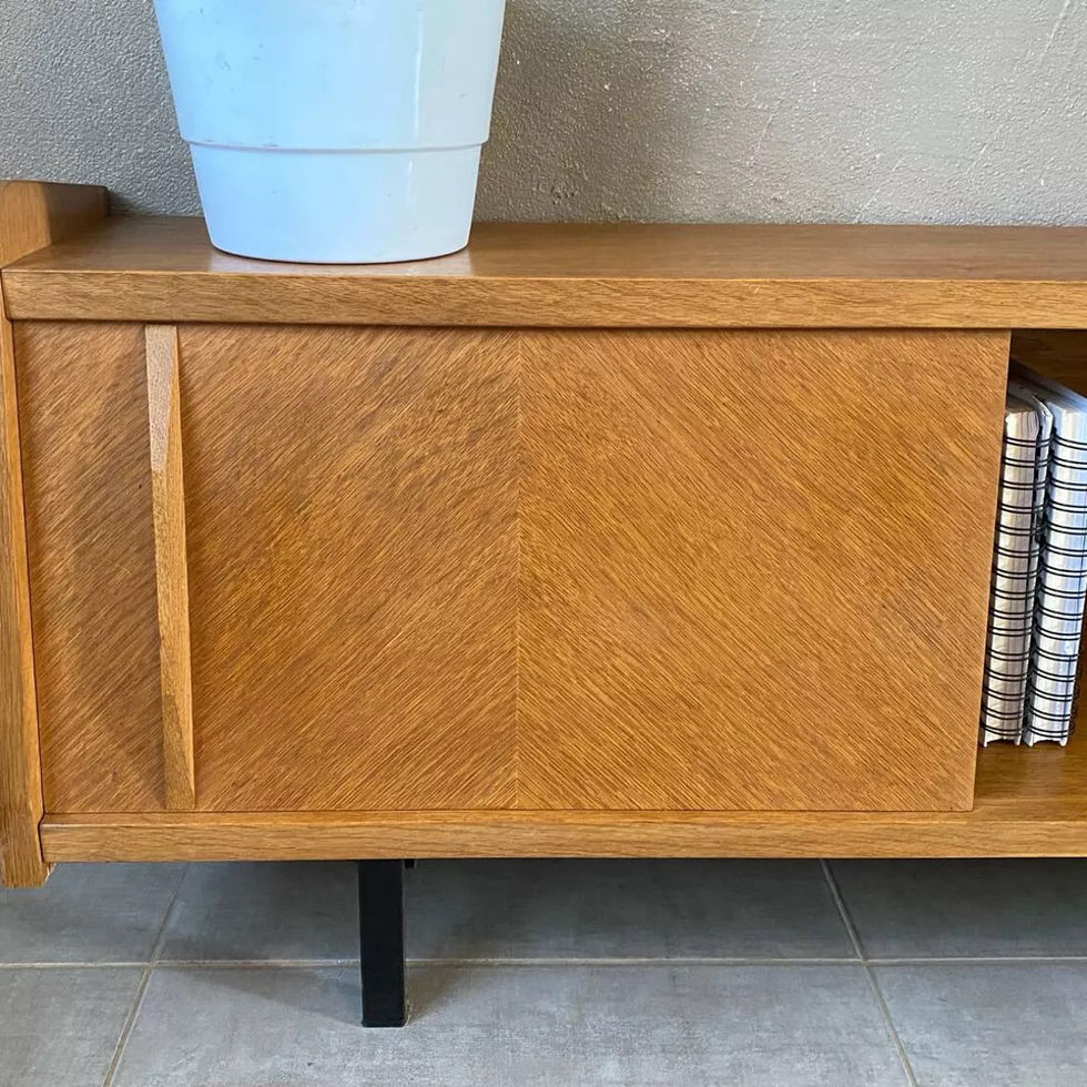 Magnifique enfilade en bois des années 60 ( peu profonde ) Portes coulissantes, teinte miel, poignées du même ton.