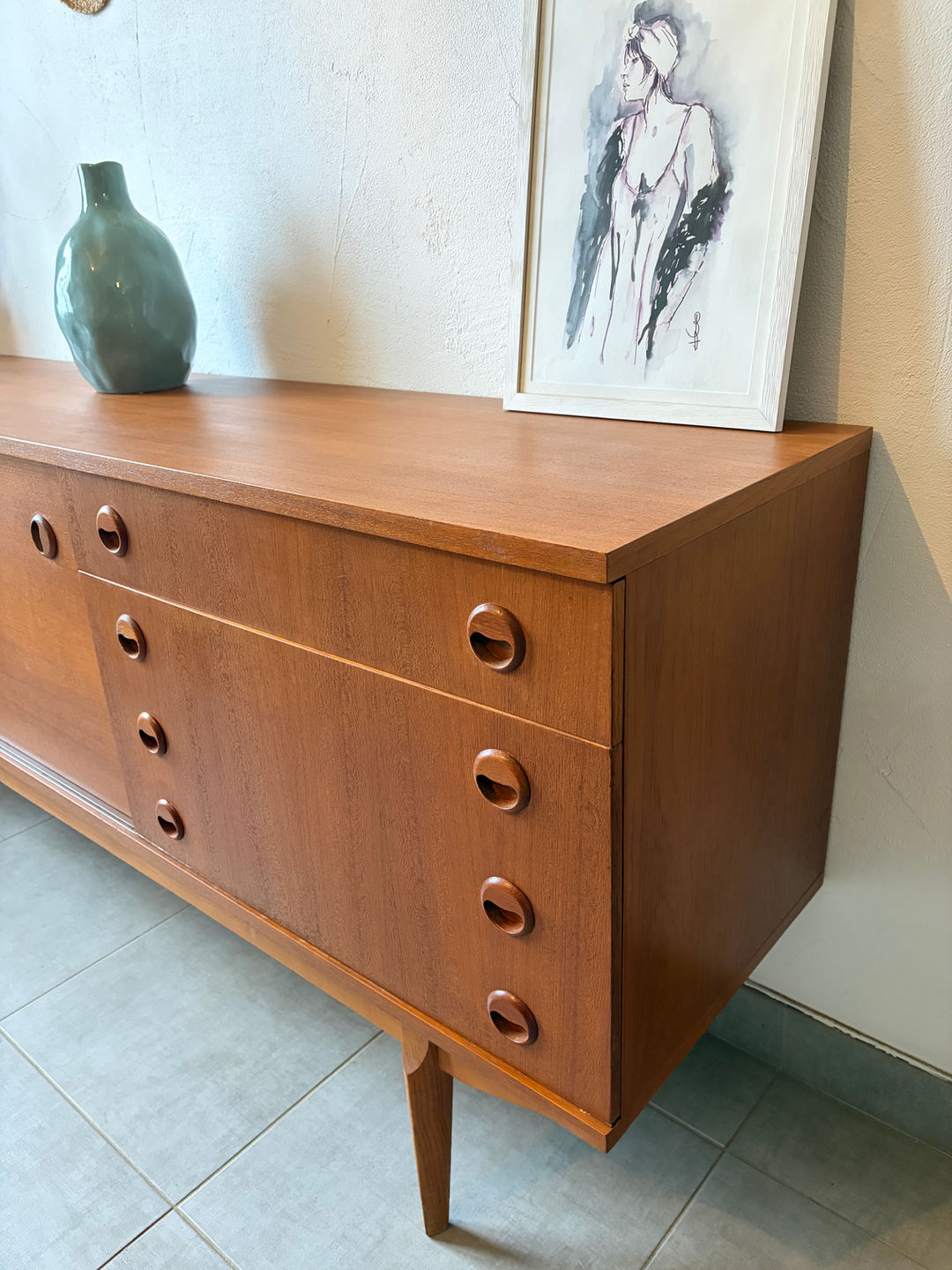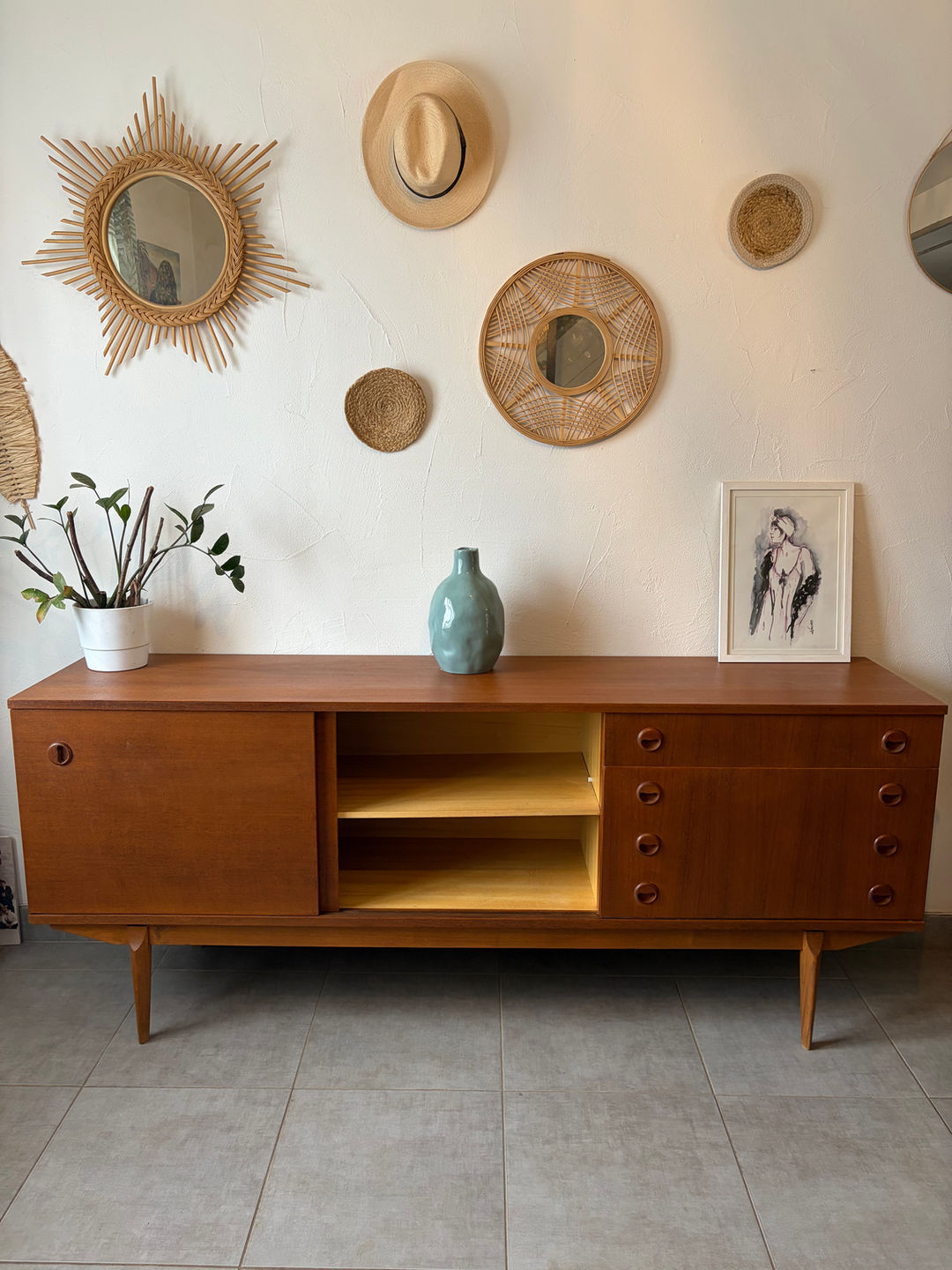 2 portes coulissantes avec une étagère intérieure ( étagère légèrement affaissée ) , 1 porte fixe battante avec 1 tablette en plexis noir , 1 tiroir , poignées rondes sculptées incrustées .