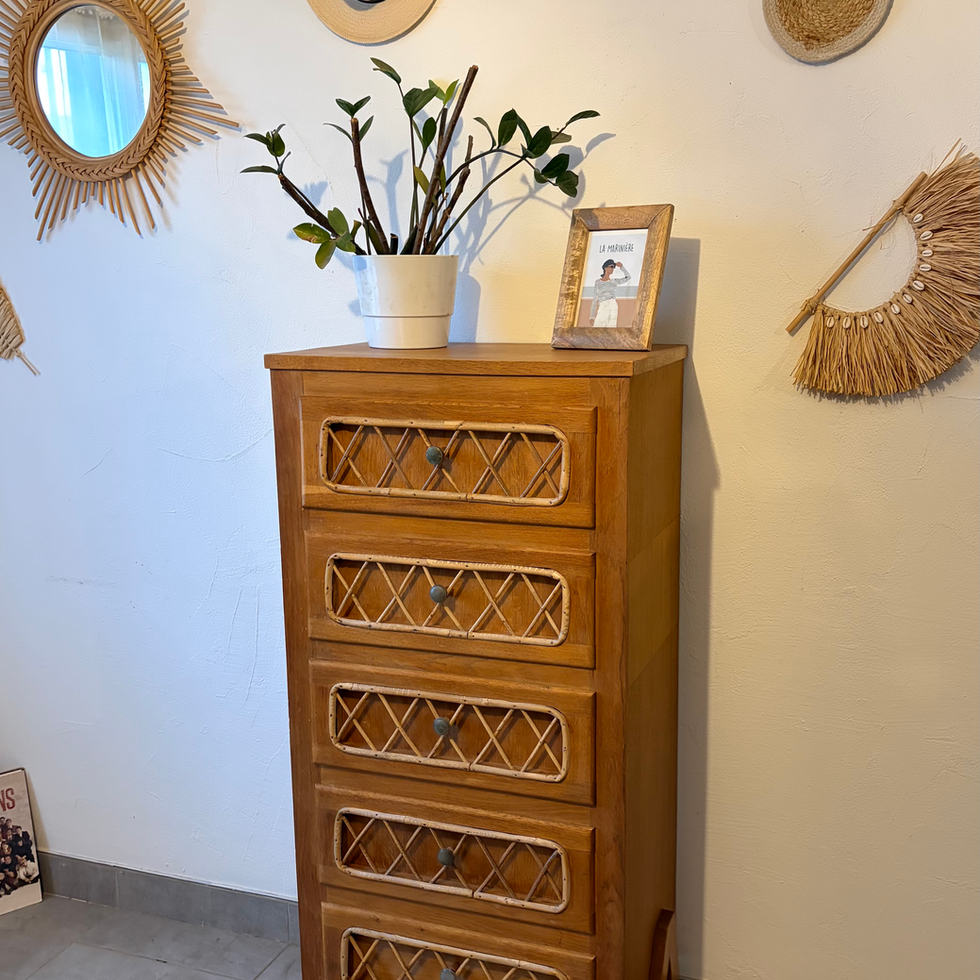 Très beau chiffonnier vintage chêne et osier